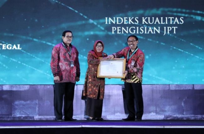 SLAWI, smpantura – Pemkab Tegal berhasil meraih dua penghargaan sekaligus dari Komisi Aparatur Sipil Negara (KASN) untuk kategori sistem merit dengan predikat baik dan manajemen talenta pada pengisian jabatan pimpinan tinggi (JPT) dengan predikat sangat baik. Sistem merit Pemkab Tegal mendapat nilai 271,5, sedangkan indeks kualitas pengisian JPT mendapat nilai 91,28 .