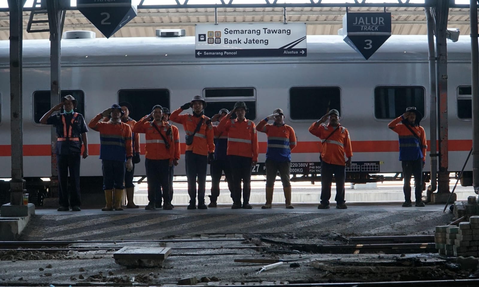 TEGAL, smpantura–  Jajaran petugas PT KAI Daerah Operasi 4 Semarang bersama para penumpang kereta api melakukan Upacara Peringatan Detik-detik Proklamasi Kemerdekaan Republik Indonesia, Sabtu (17/8/2024).