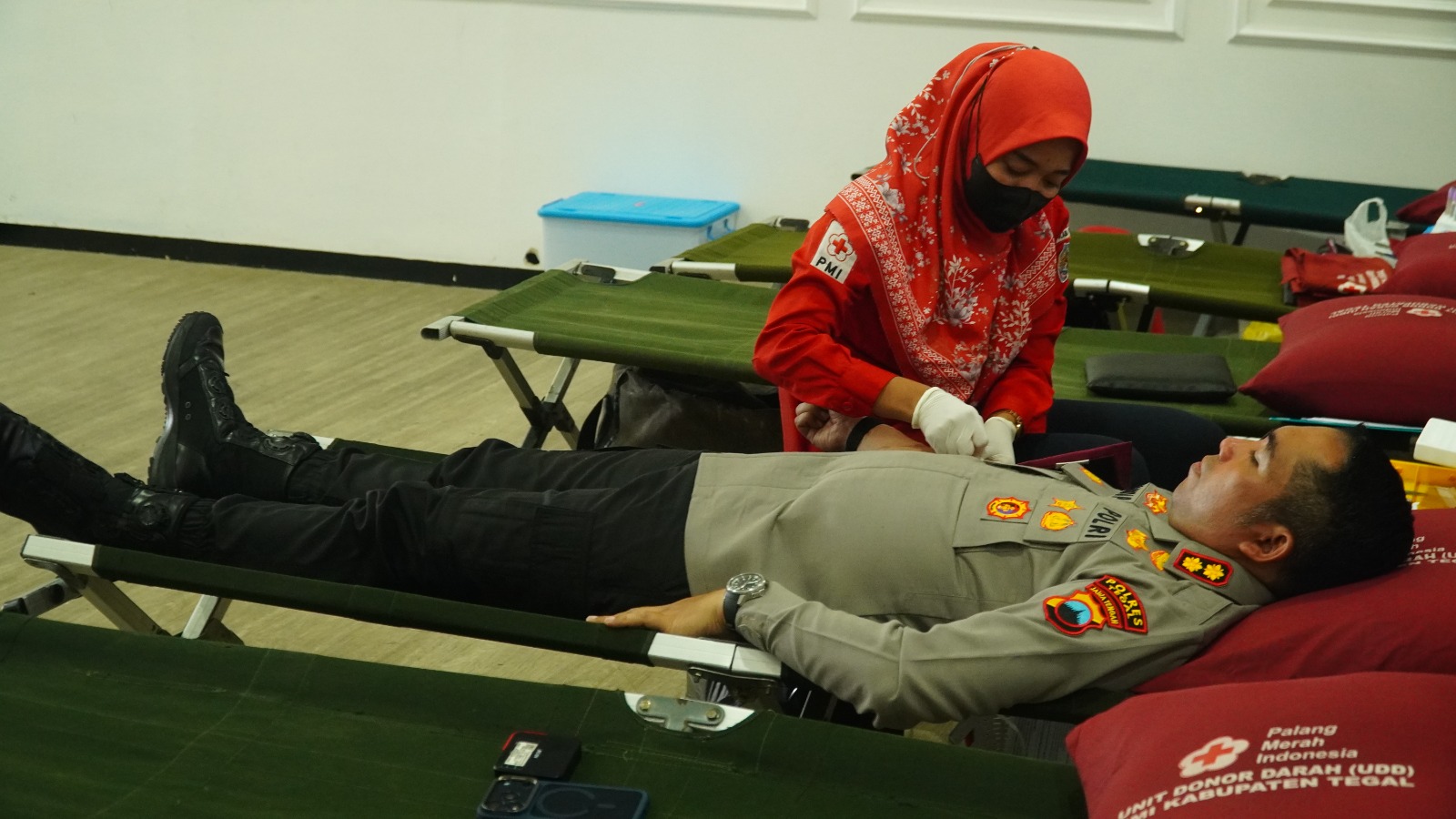 Kegiatan donor darah ini di laksanakan oleh Seksi Humas Polres Tegal bekerja sama dengan PMI Kabupaten Tegal. Di awali dengan proses absensi dan pengecekan tensi tubuh terhadap peserta yang telah ditunjuk untuk mendonorkan darahnya.