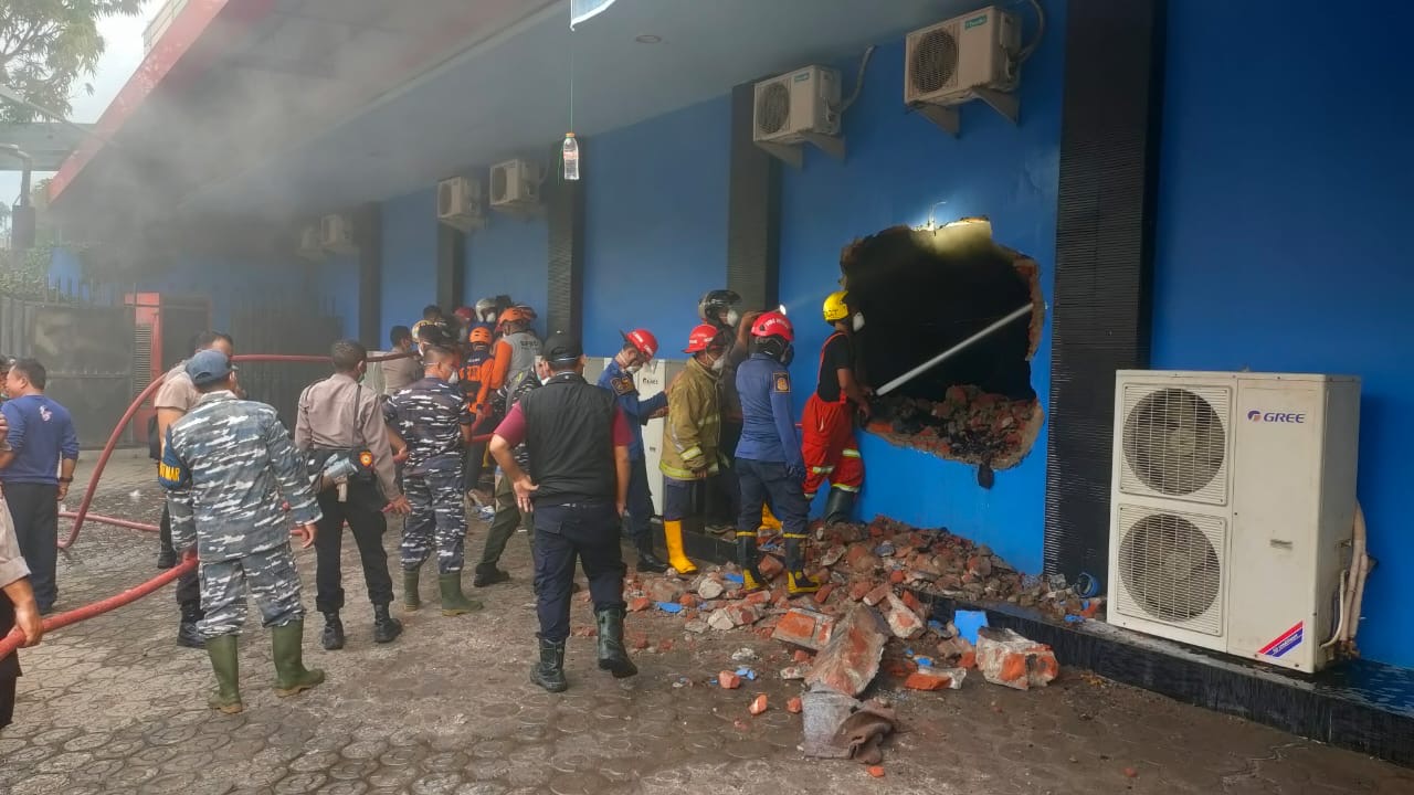 TEGAL, smpantura – Petugas gabungan dari Pemerintah Kota Tegal dan TNI Polri akhirnya menjebol dinding Happy Karaoke, untuk memudahkan petugas pemadam dalam memadamkan api, Minggu sore (26/1/2025).