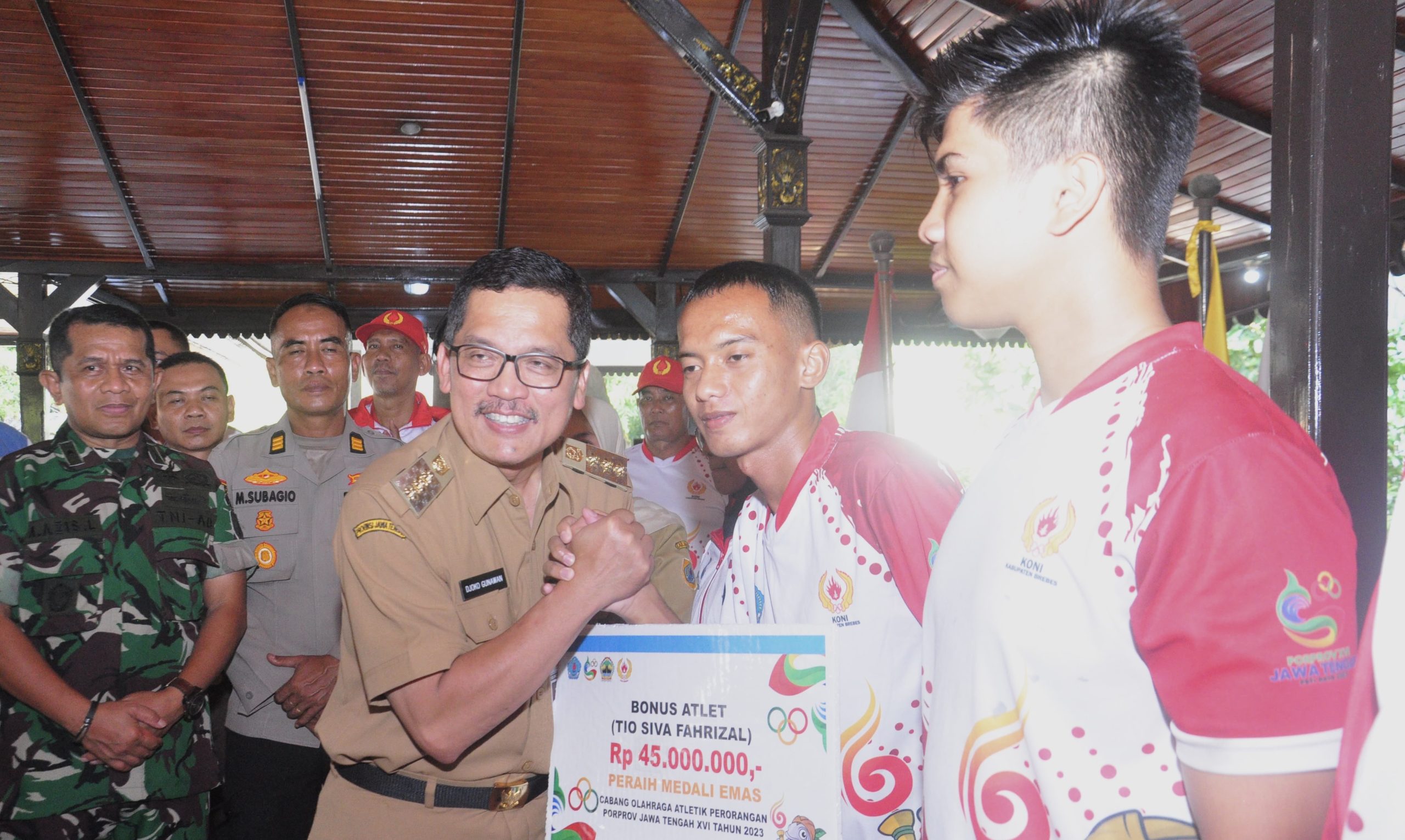 Pj Bupati Brebes Serahkan Bonus Bagi Atlet dan Pelatih Peraih Medali Porprov Jateng