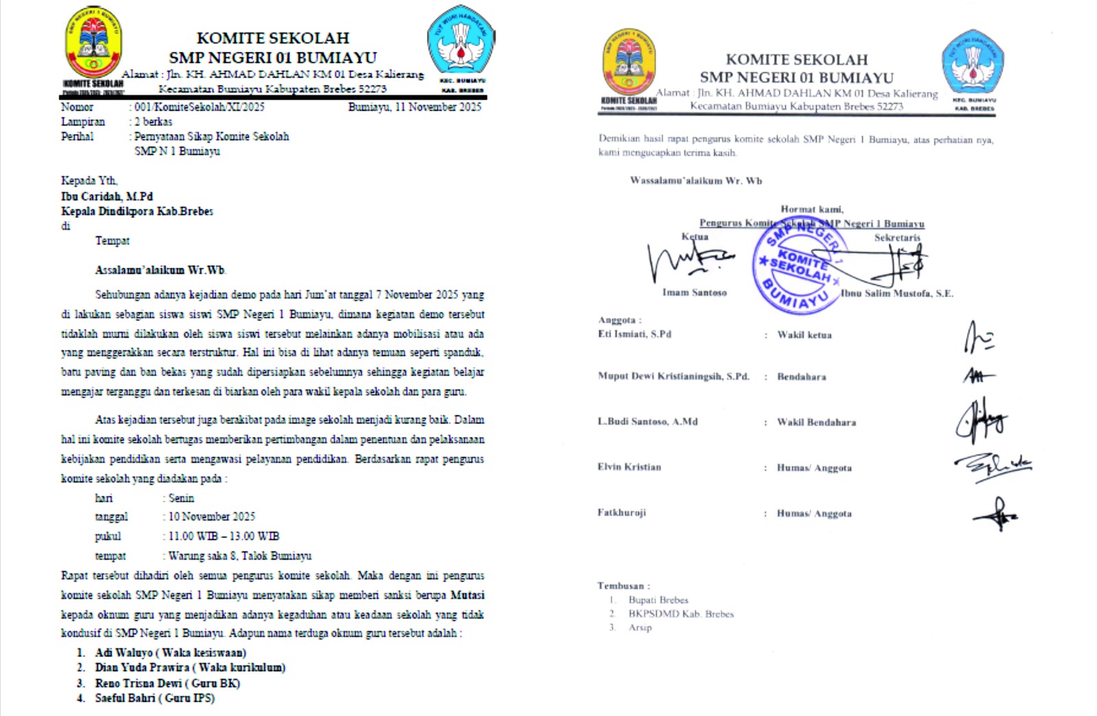 Surat Komite Sekolah tertanggal 11 November 2025 nomor 001/KomiteSekolah/XI/2025 itu, ditujukan ke Dinas Pendidikan, Pemuda dan Olahraga Kabupaten Brebes. Berisi usulah agar guru guru yang menjadi penggerak aksi demo segera dimutasi. Komite Sekolah mensinyalir aksi para siswa tersebut digerakan oleh sejumlah guru.