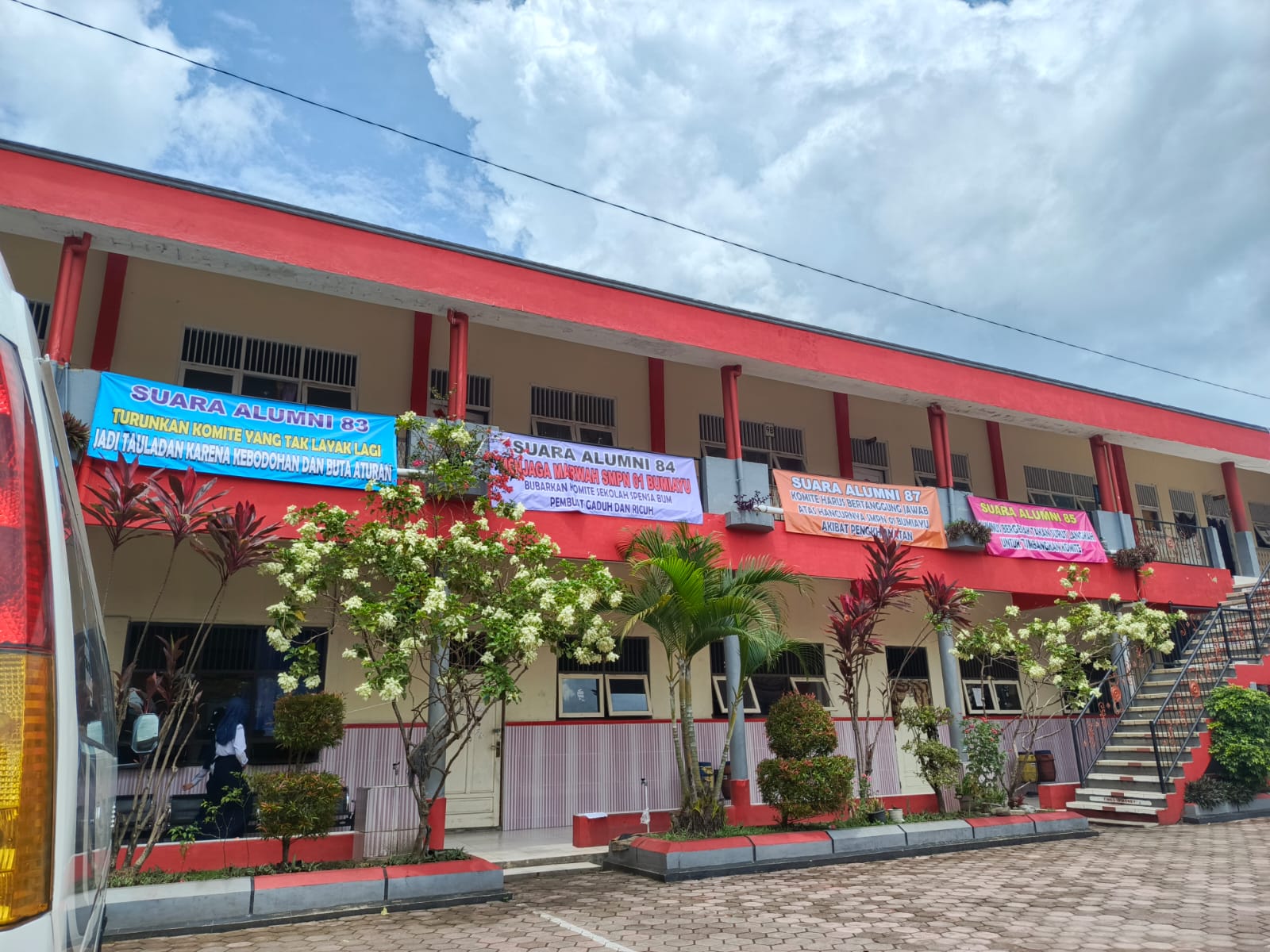 Tidak hanya itu, beberapa spanduk dari angkatan alumni lain juga tampak berdiri di sejumlah titik. Ada yang berisi seruan agar komite sekolah mundur, penolakan Ina sebagai PLT kepala SMP hingga tuntutan pembubaran komite.