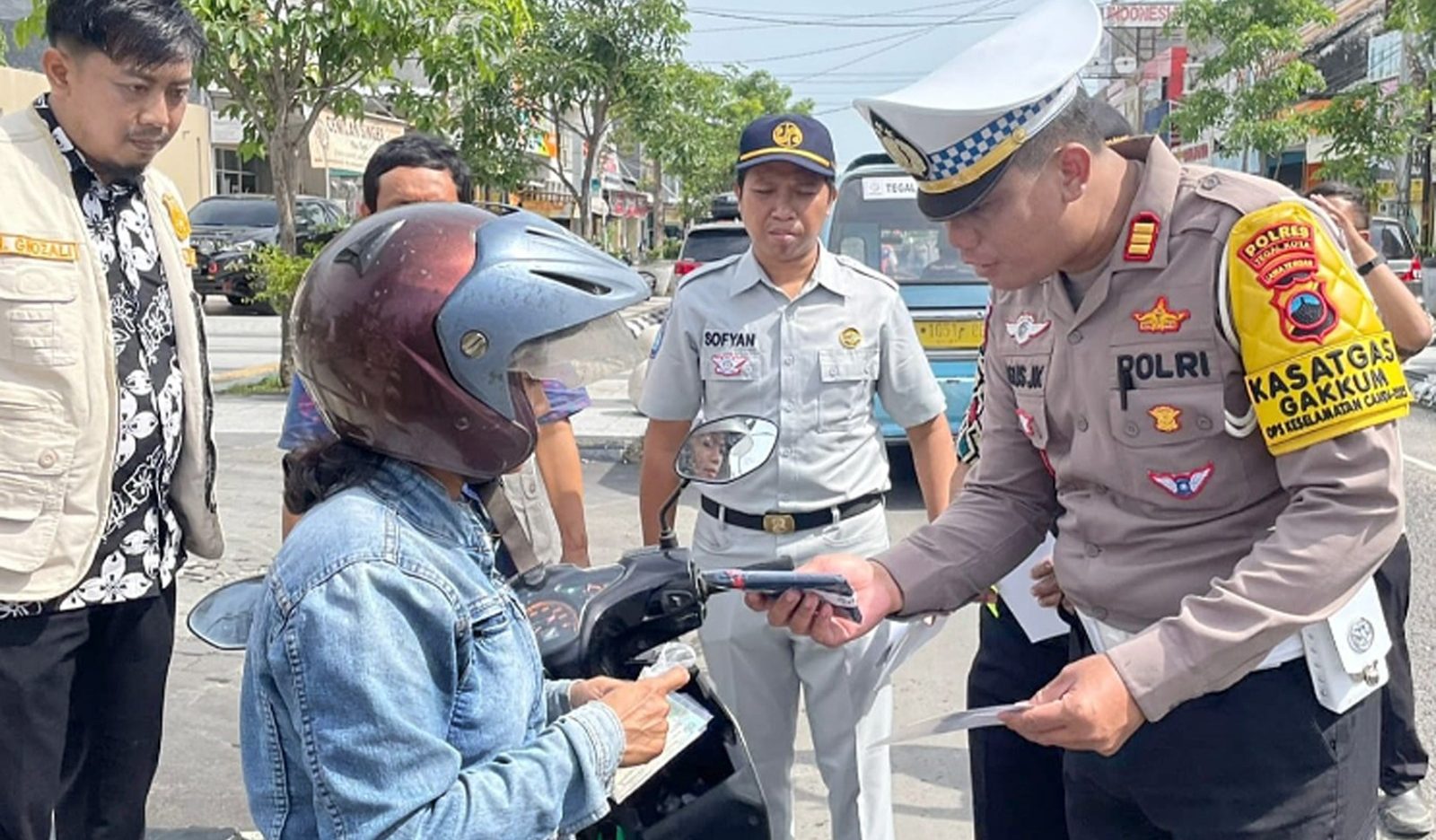 Saat berdialog dengan pengendara sepeda motor maupun pengemudi kendaraan roda empat, Kasatlantas Polres Tegal Kota AKP Agus Joko Guntoro, awalnya membagikan brosur berisi aturan tertib lalu lintas.