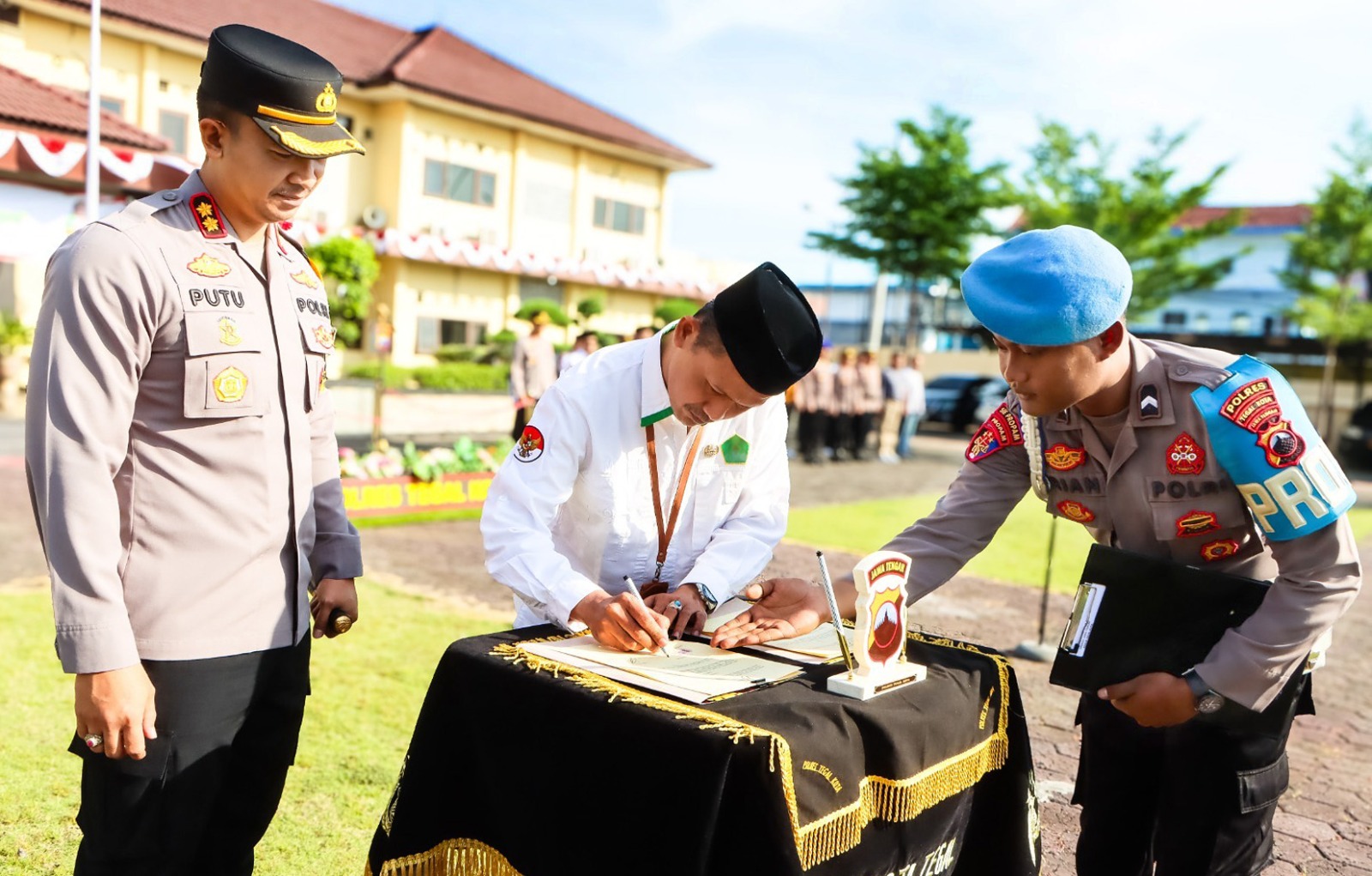 Penandatanganan nota kesepahaman untuk memperkuat peran Bhabinkamtibmas dan penyuluh agama, dilakukan Kapolres Tegal Kota AKBP I Putu Bagus Krisna Purnama, dan Kepala Kantor Kemenag Ahmad Muhdzir, di sela-sela apel bersama di halaman Mapolres Tegal Kota, Selasa (15/7).