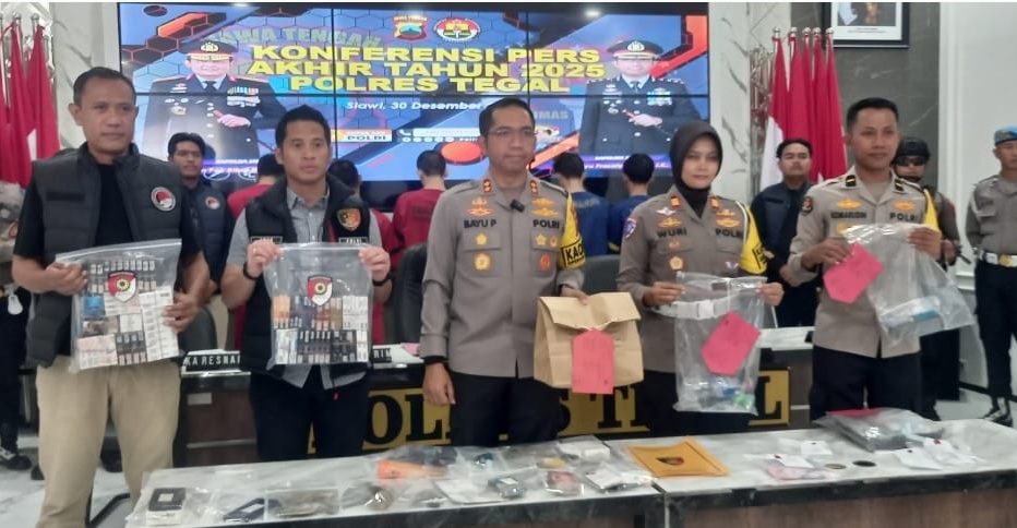 SLAWI, smpantura – Polres Tegal menggelar konferensi pers akhir tahun terkait kinerja kepolisian selama tahun 2025. Konferensi pers di Gedung Tantya Sudhirajati Mapolres Tegal, Selasa (30/12).