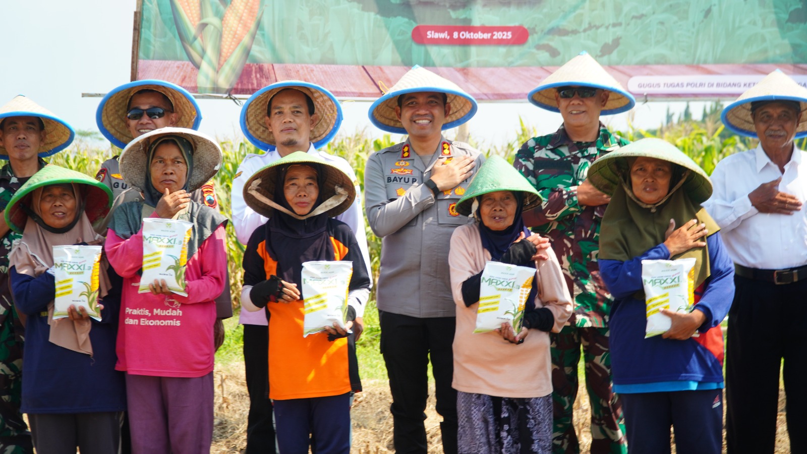 Pada acara tersebut, Kapolres Tegal secara simbolis menyerahkan benih jagung kepada kelompok tani sebagai bentuk dukungan terhadap keberlanjutan program tanam jagung di wilayah Kabupaten Tegal. Penyerahan ini disambut antusias oleh para petani yang merasa terbantu dengan adanya pendampingan dan motivasi langsung dari pihak Kepolisian.