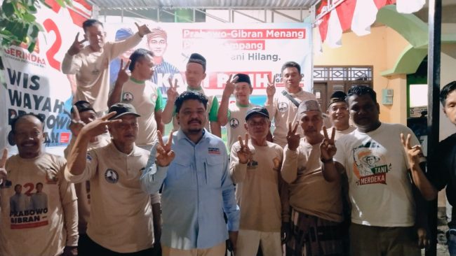 SLAWI, smpantura – Ketua Umum DPP Pedagang Pejuang Indonesia Raya (Papera) dan Tani Merdeka, Don Muzakir meresmikan beberapa Posko Tani Merdeka di Kabupaten Tegal, Rabu (3/1/2024). Mereka bertekad memenangkan pasangan calon Presiden dan Wakil Presiden, Prabowo Subianto dan Gibran Rakabuming Raka, satu putaran.