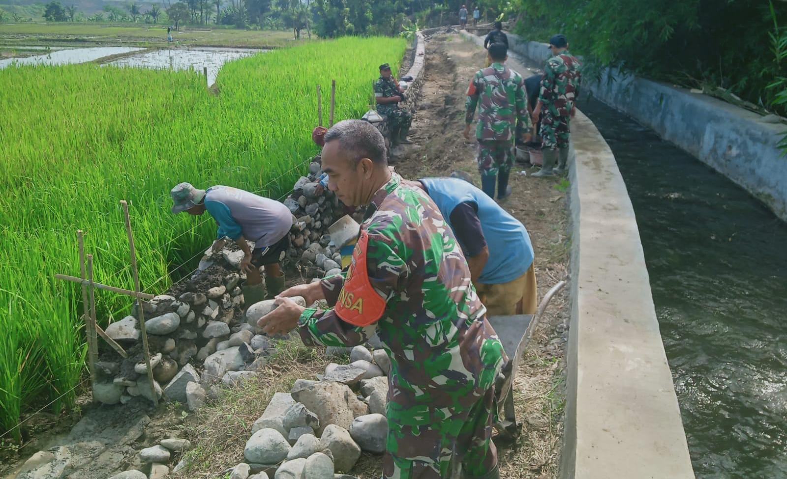 “Anggota TNI bersama warga setempat bahu-membahu mengerjakan pembangunan talud dengan panjang 238 meter, lebar 0,4 meter, dan tinggi antara 1,5 hingga 2 meter. Progres atau capaian target pekerjaan fisik membangun talud itu sudah mencapai lebih dari 50 persen,” ujar Danramil 09/Bantarbolang, Kapten Inf. Sarmin, baru baru ini.