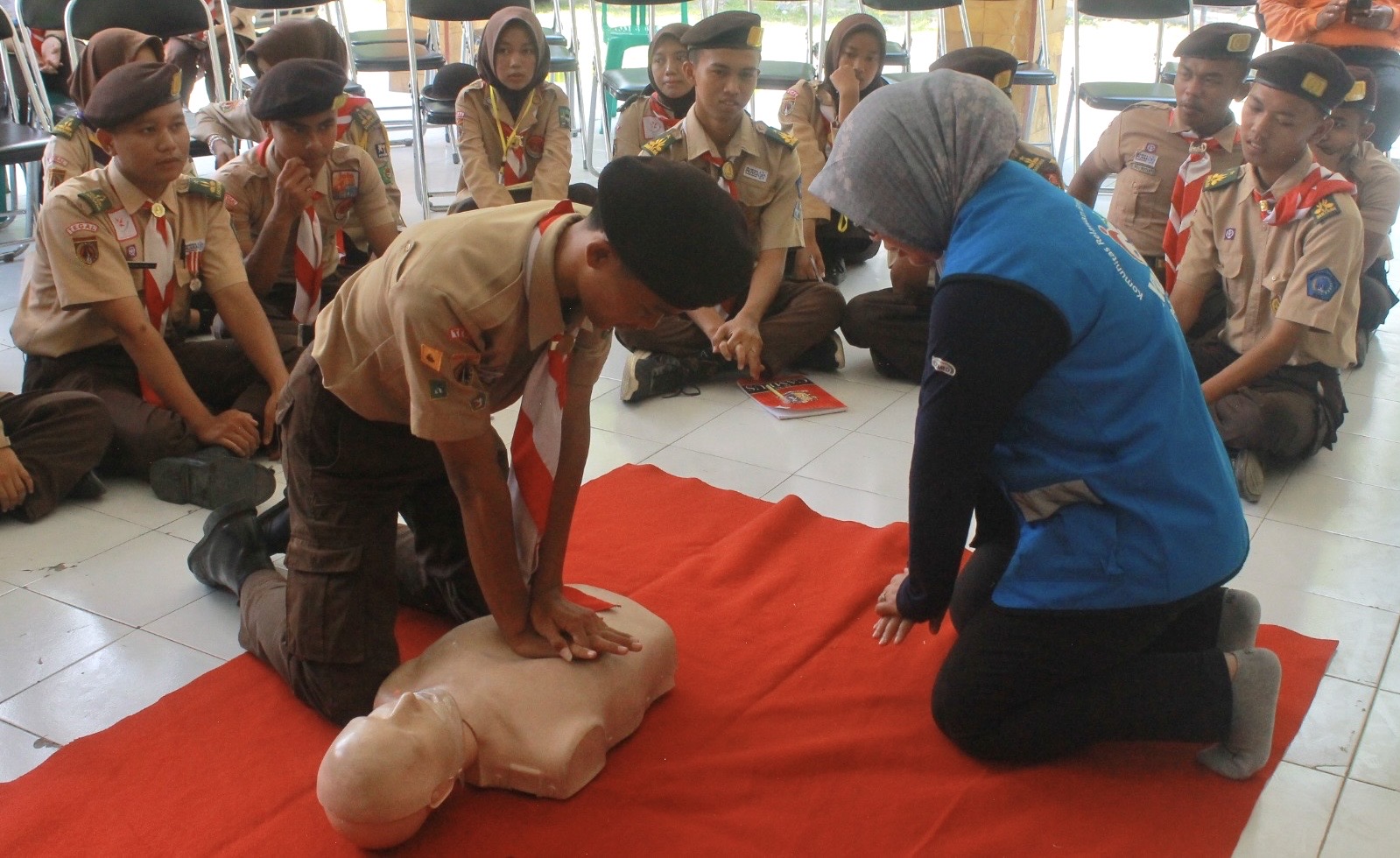 Pelatih Kreki Jawa Tengah pada kesempatan itu,mengajari peserta tentang bantuan hidup dasar. Peserta dilatuh melakukan resusitasi jantung paru-paru atau RJP dengan menggunakan alat peraga boneka.