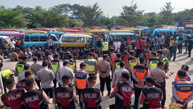 SLAWI, smpantura– Ratusan awak angkutan umum di Kabupaten Tegal melakukan aksi demo terkait beroperasinya kereta kelinci atau odong- odong, Senin (22/7).