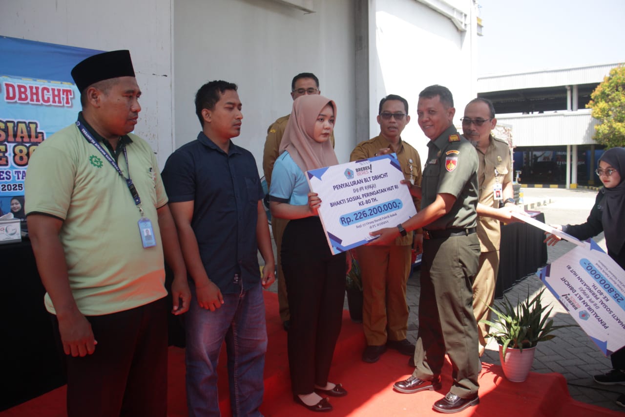 Plt Kepala Dinas Sosial Pemkab Brebes Edy Kusmartono mewakili Bupati Brebes Paramitha Widya Kusima, menyerahkan langsung BLT bagi buruh pabrik rokok ini, di Halaman PT. Hamsina Jaya MPGG, Kecamatan Bulakamba, Brebes. Penyerahan bantuan juga disaksikan Camat Bulakamba Setiawan Nugroho dan pejabat lainnya.