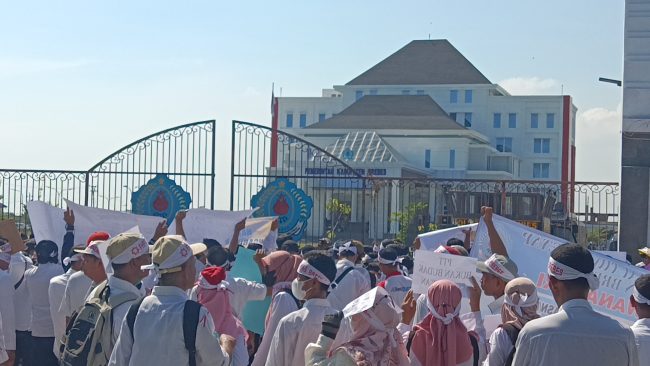 BREBES, smpantura – Ratusan Pegawai Tidak Tetap (PTT) di jajaran Pemkab Brebes menggelar aksi demo di depan Kantor Pemerintahan Terpadu (KPT) Kabupaten Brebes, Senin (22/4/2024) pagi. Mereka berunjukrasa menuntut untuk diangkat sebagai Pegawai Pemerintah dengan Peejanjian Kerja (P3K).