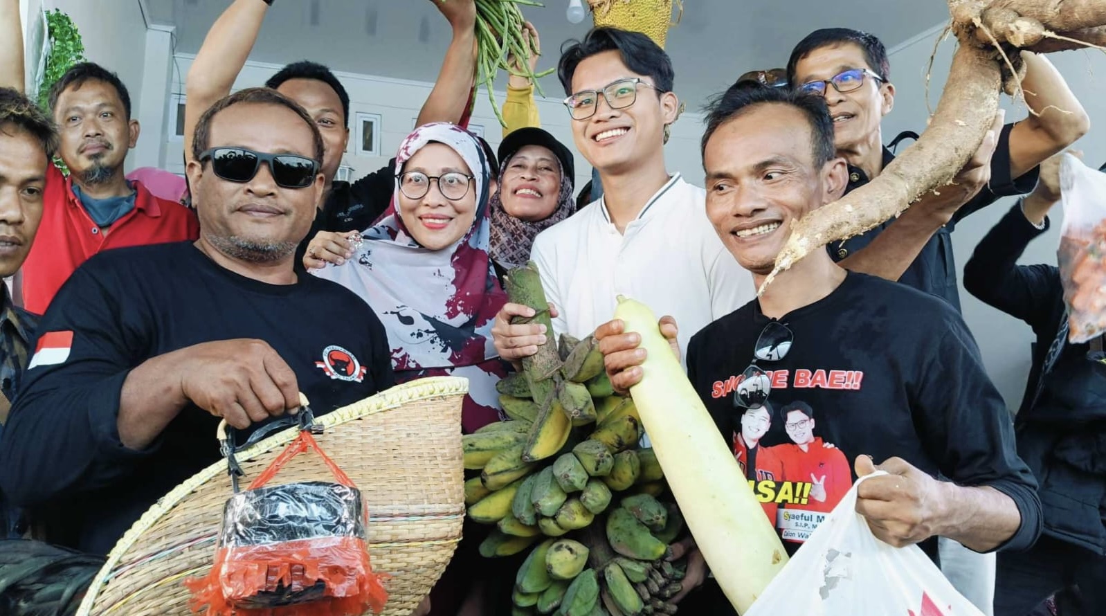 SLAWI, smpantura – Ratusan warga dari sejumlah wilayah di Kabupaten Tegal memberikan sumbangan kepada Calon Wakil Bupati Tegal, M Saeful Mujab di kediaman Mujab di RT 7 RW 2 Desa Tembok Luwung, Kecamatan Adiwerna, Kabupaten Tegal, Sabtu (21/9/2024). Warga yang membawa hasil bumi sebagai bentuk dukungan terhadap Mujab yang berpasangan dengan Calon Bupati Tegal (Cabup), Bima Eka Sakti.