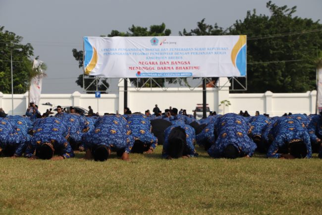 BREBES, smpantura – Aksi unik dilakukan ribuan Pegawai Pemerintahan dengan Perjanjian Kerja (P3K) di Kabupaten Brebes, usai mereka diambil sumpah dan menerima Surat Keputusan (SK) Pengangkatan, Senin (21/5/2024), di halaman Kantor Pemerintahan Terpatu (KPT) Brebes. Ribuan P3K dari tenaga pendidik, kesehatan dan teknis lainnya tersebut, langsung melakukan sujud syukur di lapangan KPT Brebes.