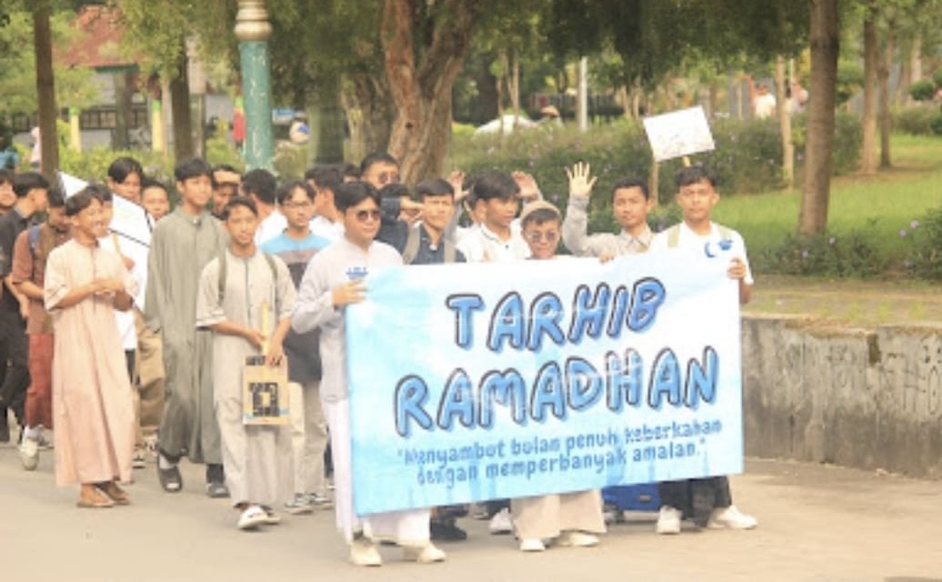 Sambil berjalan kaki, para siswa membawa bendera plastik merah putih, miniatur masjid, balon dan poster bertema menyambut Bulan Suci Ramadan 1446H/2025 dan ajakan menunaikan ibadah puasa.