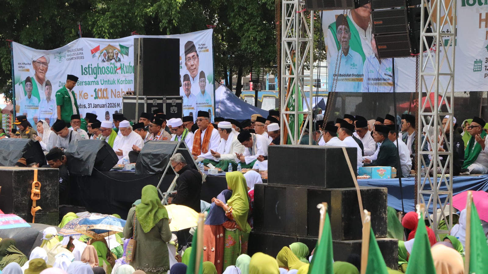BREBES, smpantura – Ribuan warga Nahdliyin dan santri di Kabupaten Brebes melaksanakan Istighosah Kubro di Alun-alun Brebes, Sabtu (31/1/2026). Kegiatan yang menjadi puncak peringatan Hari Lahir (Harlah) ke 100 Nahdlatul Ulama (NU), juga di hadiri Bupati Paramitha Widya Kusuma.