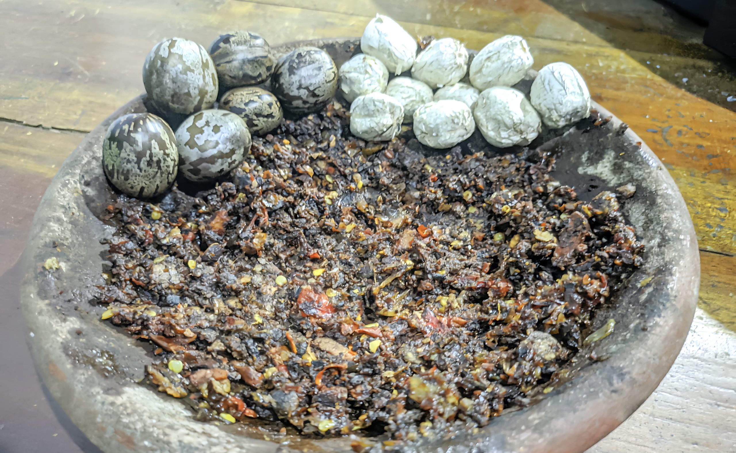 Terakhir, ulek daging biji karet dengan bahan yang sudah digoreng dan bumbu lainnya. Dirinya juga bercerita, sekarang biji karet sudah mulai langka karena pihak perkebunan karet membatasi pertumbuhan karet untuk mengeluarkan biji. Hal ini dilakukan pihak pengelola perkebunan untuk meningkatkan produksi karet.