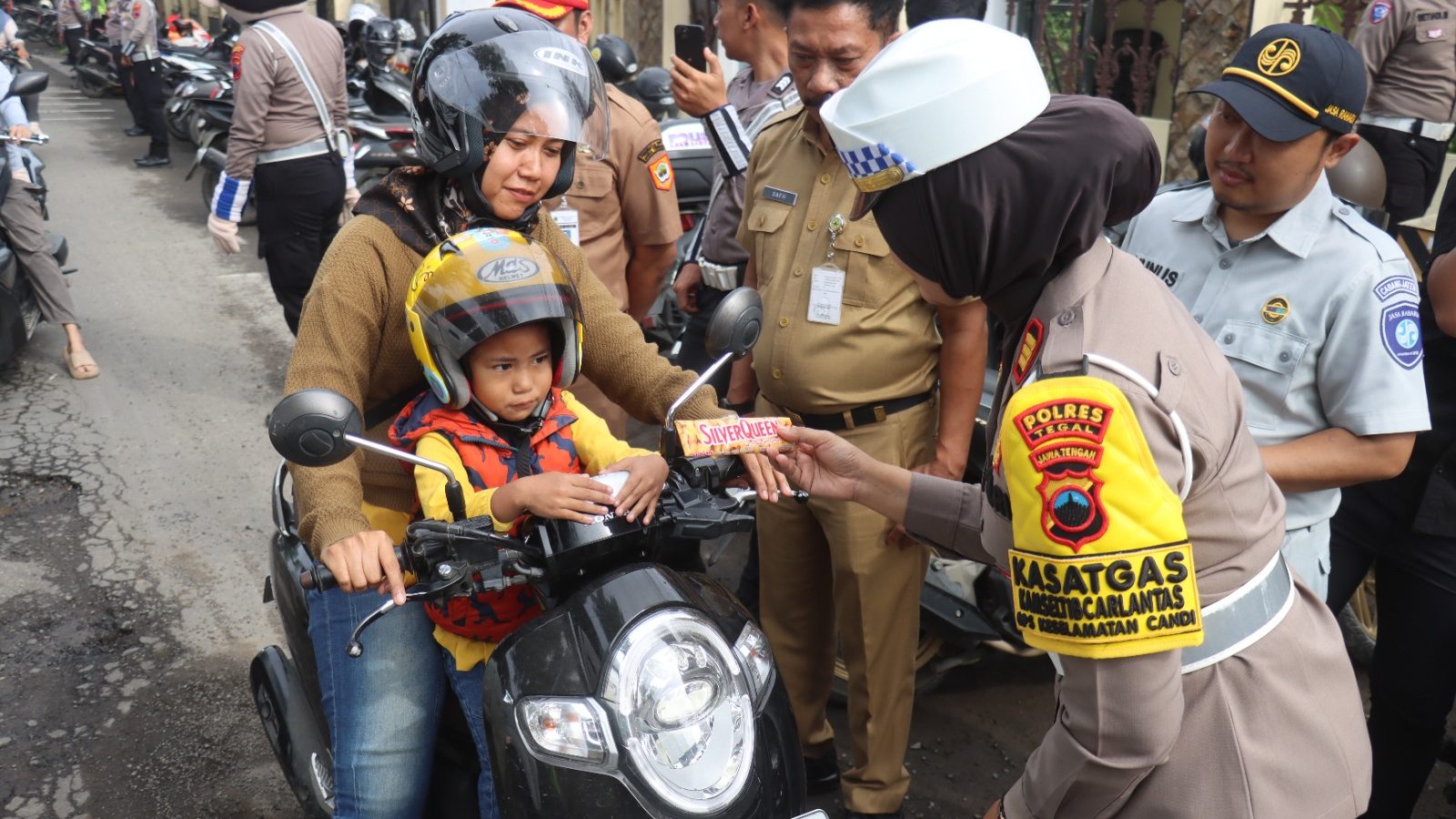 Salah seorang pengendara roda dua, Purwadi (53) sempat kaget saat di hentikan oleh Kasatlantas Polres Tegal di depan Mapolres Tegal. Tak di sangka dia mendapat hadiah helm baru dari Kasatlantas. Helm berwarna hitam ini bahkan langsung di pasangkan di kepalanya menggantikan helm lamanya yang sudah usang.