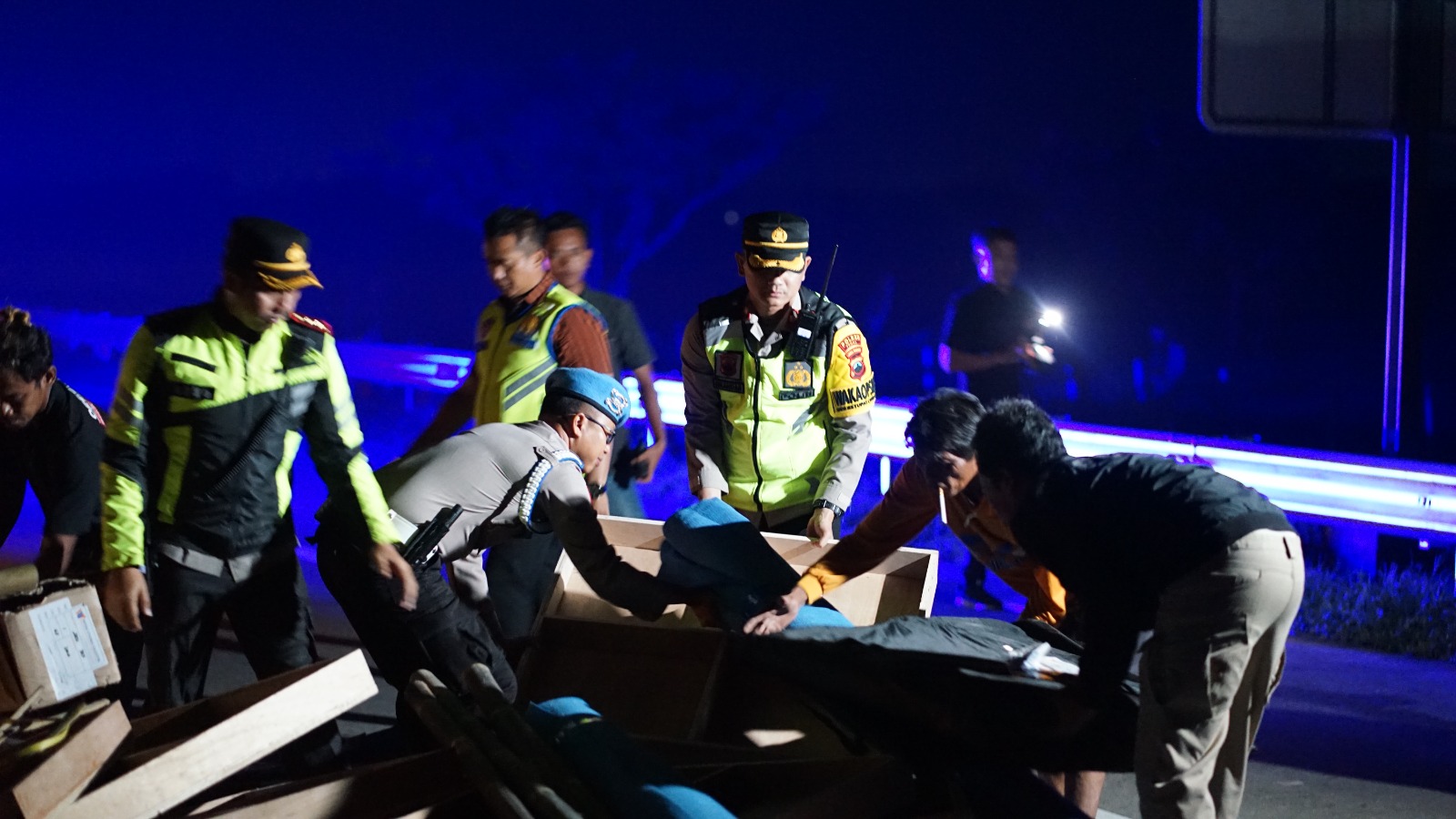 Barang muatan yang sempat berserakan turut diamankan ke luar badan jalan, sehingga proses sterilisasi sebelum penerapan one way nasional dapat berjalan dengan lancar.