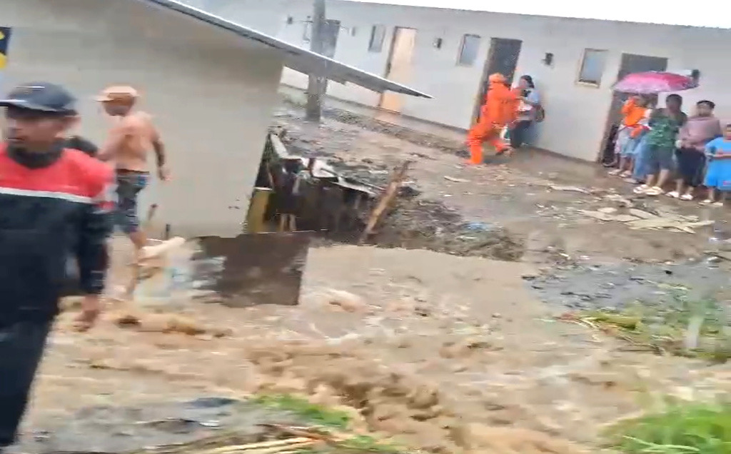 Dalam video yang beredar di sejumlah grup WhatsApp, tampak air mengalir deras melalui jalur sempit di antara deretan bangunan huntara, bahkan masuk hingga ke bagian depan beberapa unit.