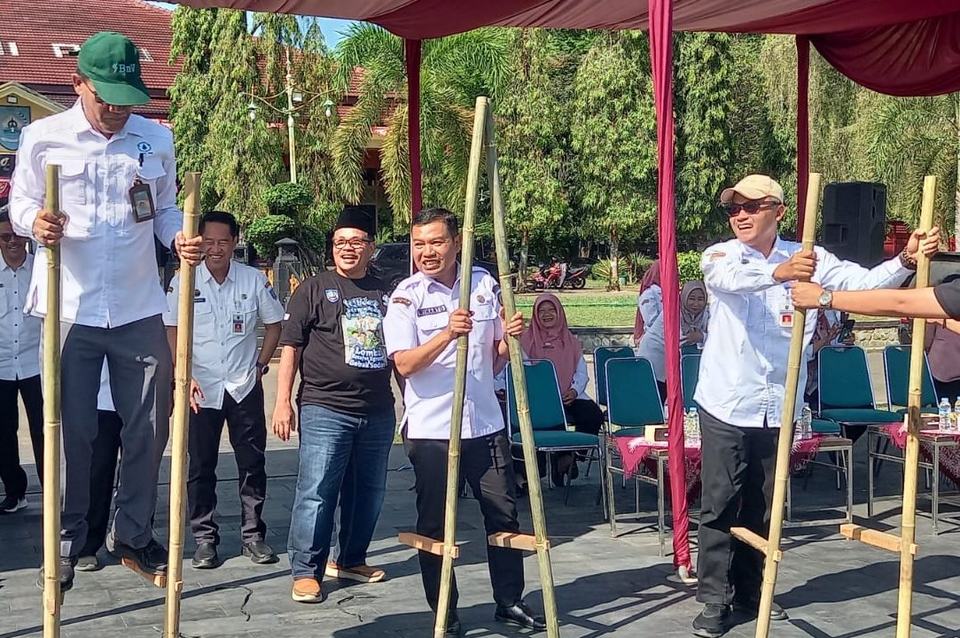 Sejumlah Pejabat Kabupaten Tegal Bermain Egrang di pembukaan Festival Permainan Tradisional di Lapangan Kabupaten Tegal, Rabu (27/8/2025).