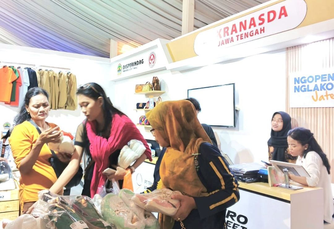 Stan ini memamerkan sepatu sebagai produk unggulan yang murah dan berkualitas. Salah seorang pengunjung yang memborong produk sepatu adalah Elsa Dewantara, warga Semarang Selatan, Kota Semarang.
