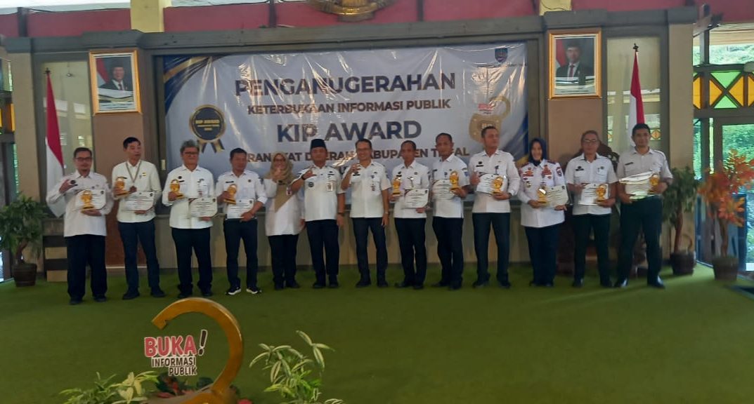 SLAWI, smpantura – Sepuluh badan publik perangkat daerah Kabupaten Tegal menerima penghargaan Keterbukaan Informasi Publik (KIP) Award kategori informatif. Penghargaan di serahkan Bupati Tegal Ischak Maulana Rohman pada acara Penganugerahan KIP Award Perangkat Daerah Kabupaten Tegal 2025. Yang di selenggarakan Dinas Komunikasi dan Informatika Kabupaten Tegal, Rabu (3/12/2025) pagi di Pendapa Amangkurat Pemkab Tegal.