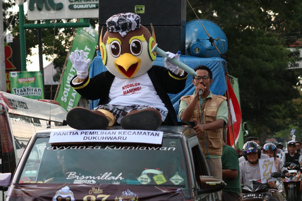 Kirab keliling desa se- Kecamatan Dukuhwaru. bertujuan untuk mengenalkan maskot resmi pemilihan Bupati Tegal. Selain itu juga sebagai sarana sosialisasi tahapan pemilihan serentak tahun 2024 kepada masyarakat.