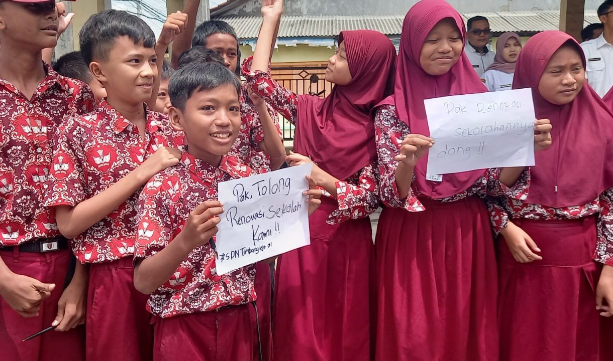 Di kertas putih itu, para siswa menulis permohonan agar sekolah mereka diperbaiki, diantaranya “Tolong Renovasi Sekolah Kami”, “Pak Sekolahnya Rusak, Jendelanya Bolong”.