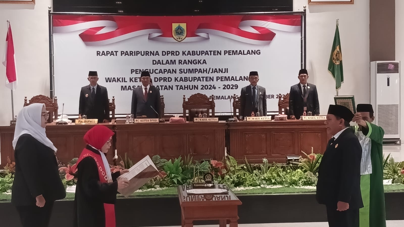 “Rapat paripurna hari ini dalam rangka pengucapan sumpah janji wakil ketua DPRD Pemalang dari Fraksi Partai Kebangkitan Bangsa (PKB) atas nama Slamet Ramuji. Sebelumnya diketahui bersama, saat pengumuman nama calon pimpin DPRD FPKB menarik usulannya, tetapi usulan tiga nama pimpinan lainnya prosesnya terus berjalan hingga pelantikan tiga pimpian dewan,” ujar Martono Ketua DPRD Pemalang, Rabu (30/10).
