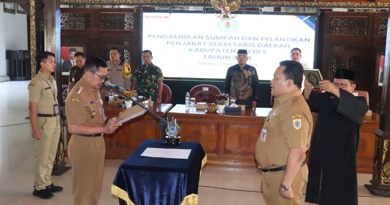 BREBES, smpantura – Penjabat (Pj) Bupati Brebes, Djoko Gunawan melantik Kepala Dinas Pekerjaan Umum (DPU) sebagai Pj Sekretaris Daerah (Sekda) Kabupaten Brebes, Senin sore (7/10/2024). Sutaryono yang sebelumnya juga ditunjuk sebagai Pelaksana Harian (Plh) Sekda, dilantik berdasarkan Surat Keputusan Bupati Brebes Nomor 800.1.3.3/2819 Tahun 2024 Tentang Penunjukan Penjabat Sekretaris Daerah Kabupaten Brebes.