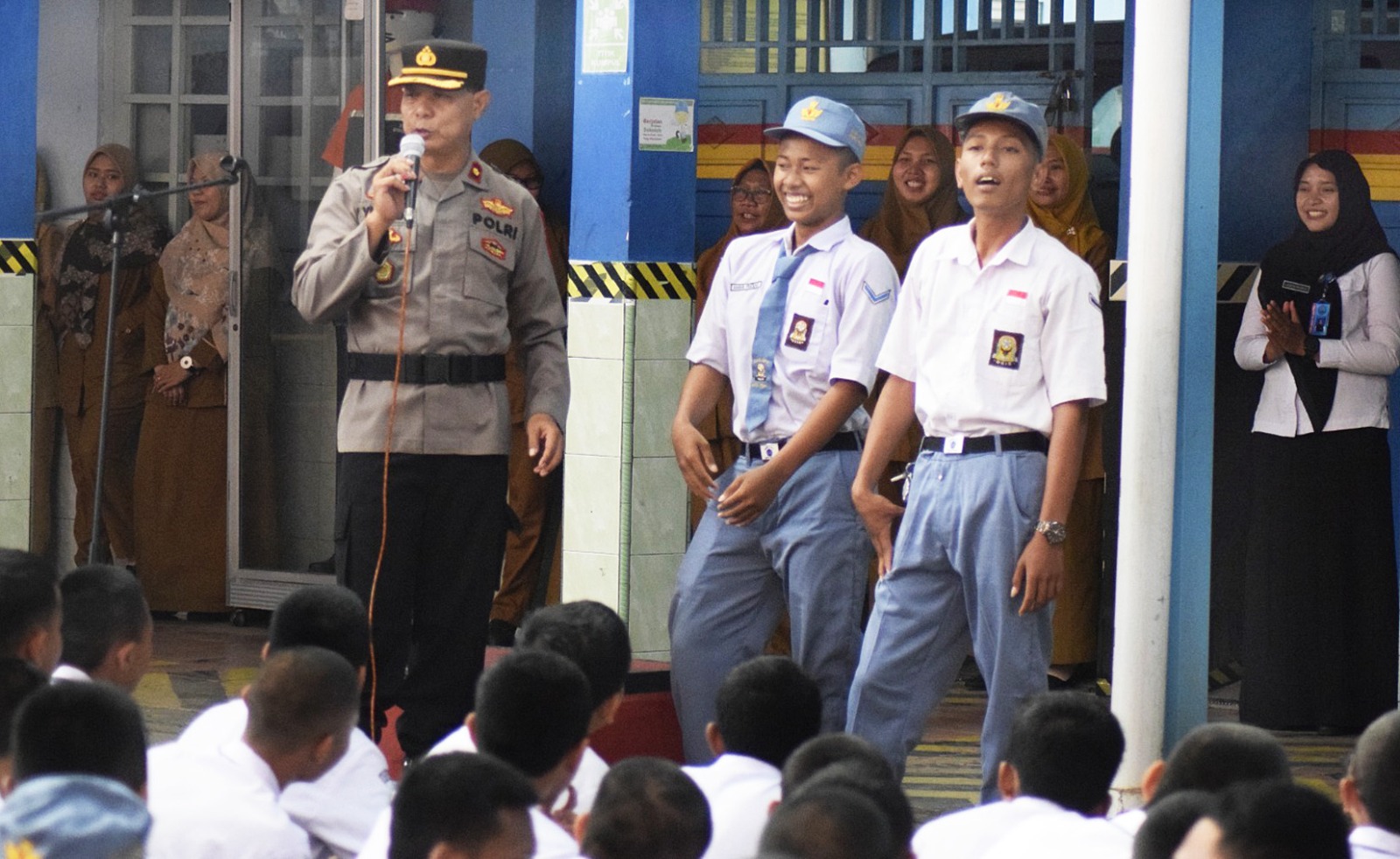 TEGAL, smpantura – Program polisi Blusukan ke sekolah oleh Polres Tegal Kota kini terus di tingkatkan. Bukan hanya menggandeng Kemendag dengan kegiatan bertajuk Sapa Mas Bagus, tapi rutin berdialog santai dengan pelajar, di tiap Apel Pagi di sejumlah sekolah.