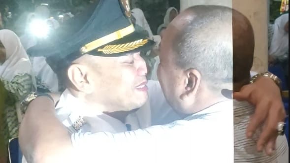 Tak kuasa menahan air mata, Dedy Yon menangis di pelukan Ketua Relawan Berdikari, Ahmad Firdaus Muhtadi.