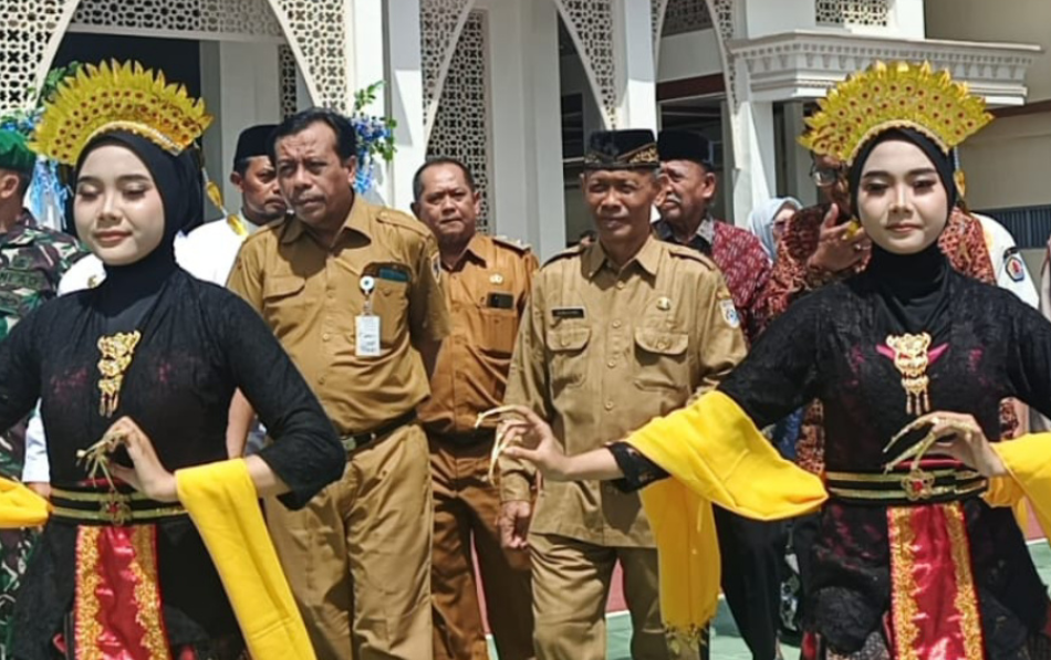 Staf Ahli Bupati Brebes, Sumarno, mewakili Bupati, memotong pita dan tumpeng sebagai tanda peresmian masjid dan lapangan olahraga.