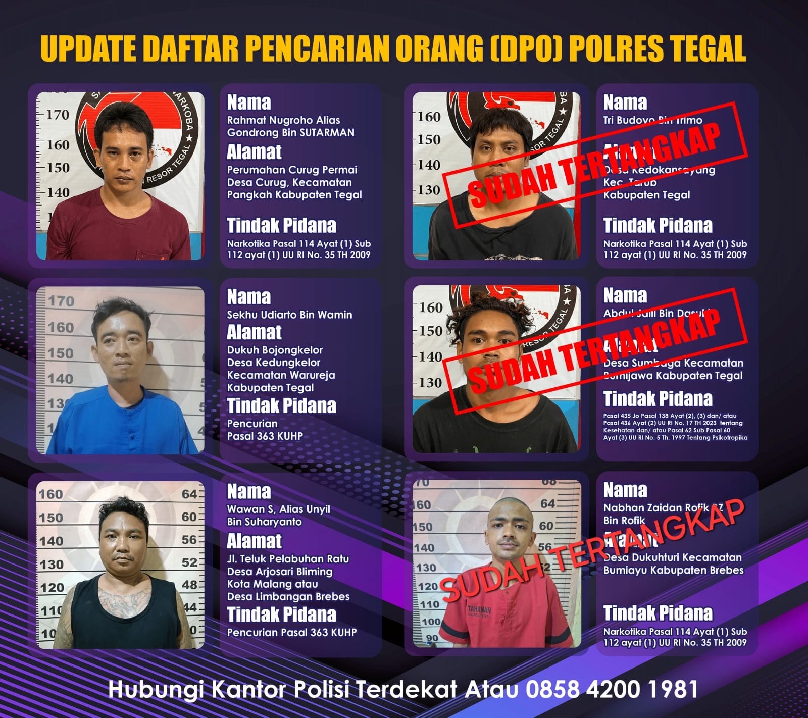 “Apabila masyarakat menemukan DPO dengan ciri- ciri seperti itu harap melaporkan ke nomor 085842001981,” tuturnya. (**)