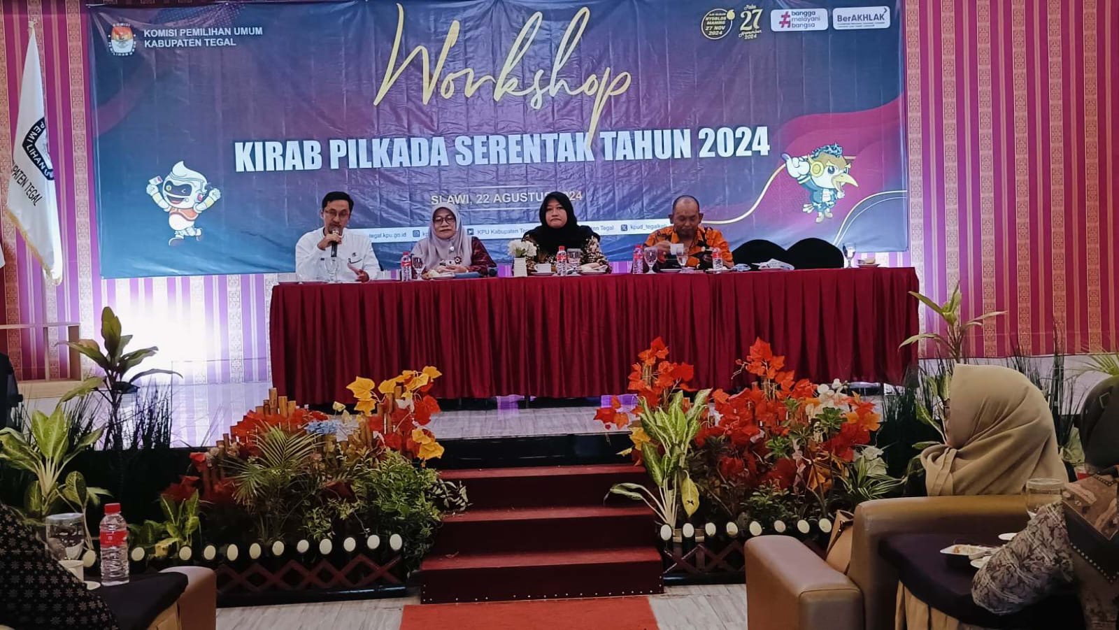 Untuk peningkatkan pastisipasi masyarakat dalam Pilkada Tegal tahun 2024, KPU Kabupaten Tegal akan mengadakan Kirab Pilkada Serentak 2024 yang digelar di setiap daerah pemilihan (dapil) mulai 5-25 September 2024. Untuk mengawali kirab tersebut, KPU menggelar workshop Kirab Pilkada Serentak 2024 di Grand Dian Hotel Slawi, Kamis (22/8/2024). Kegiatan yang dihadiri PPK se-kabupaten Tegal itu, diisi pemateri dari Kepala Bagian Pemerintahan Setda Tegal Dani Setiawan, Kepala Kominfo Kabupaten Tegal Nurhayati, dan Kepala Kesbangpol Kabupaten Tegal Aji Permana.