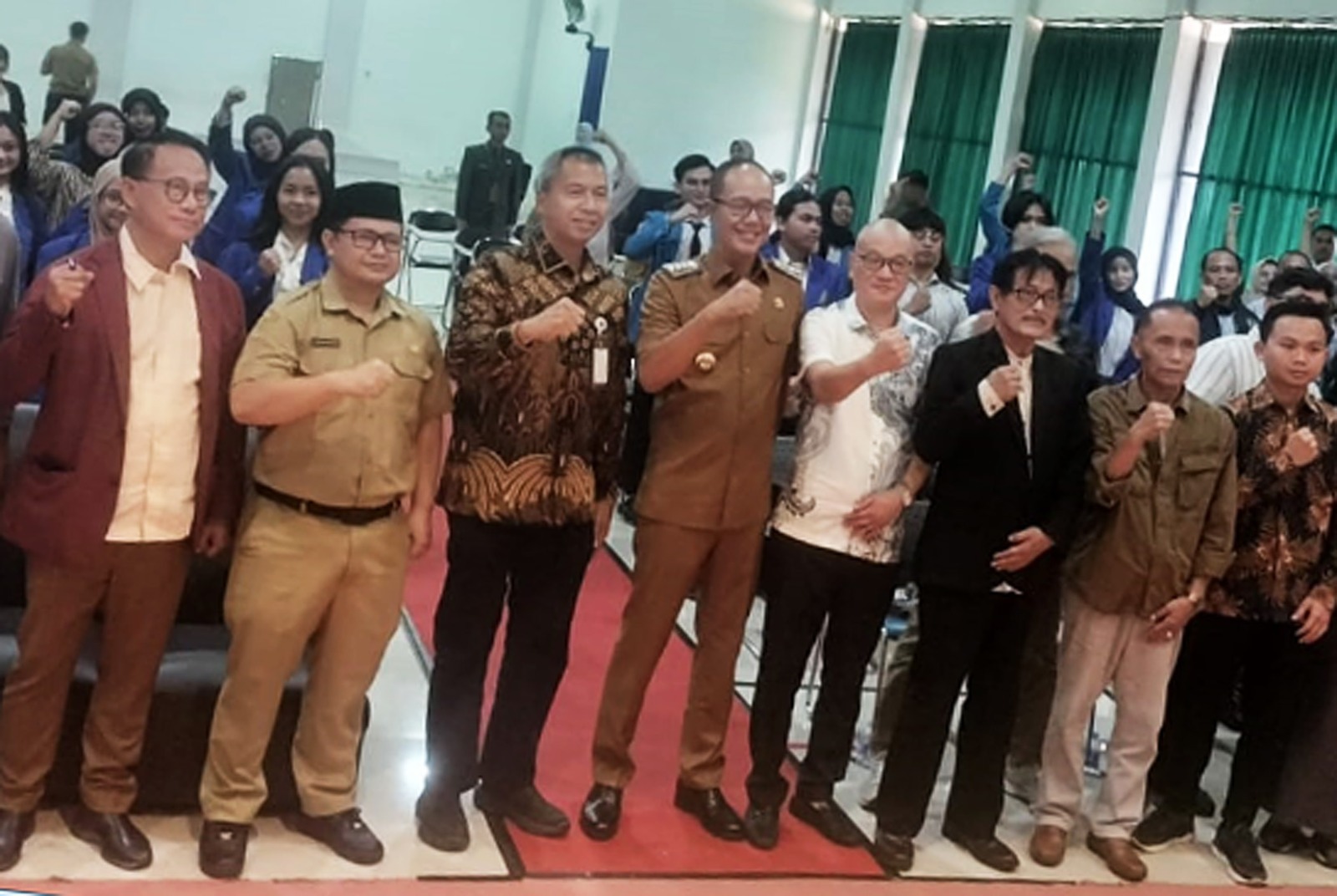 Pimpinan perguruan tinggi, Wali Kota Sukabumi Ayep Zaki SE MM, mahasiswa dan perwakilan perusahaan Taiwan, usai kegiatan ''Sosialisasi dan Penjelasan Magang Internasional ke Taiwan'', berfoto bersama di Aula Politeknik Sukabumi, Jabar.
