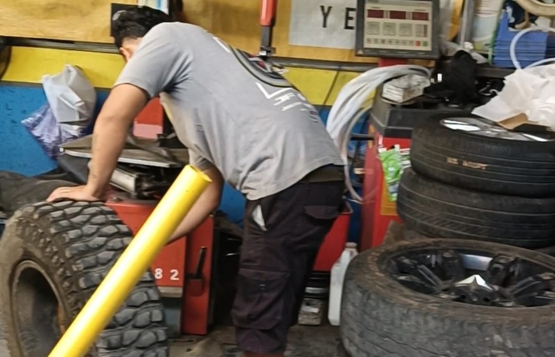 Tukang bengkel tambal ban memperbaiki ban yang bocor di Bengkel Araya Wheel Gallery Tegal, Kabunan, Kabupaten Tegal, Rabu, 27 Agustus 2025.