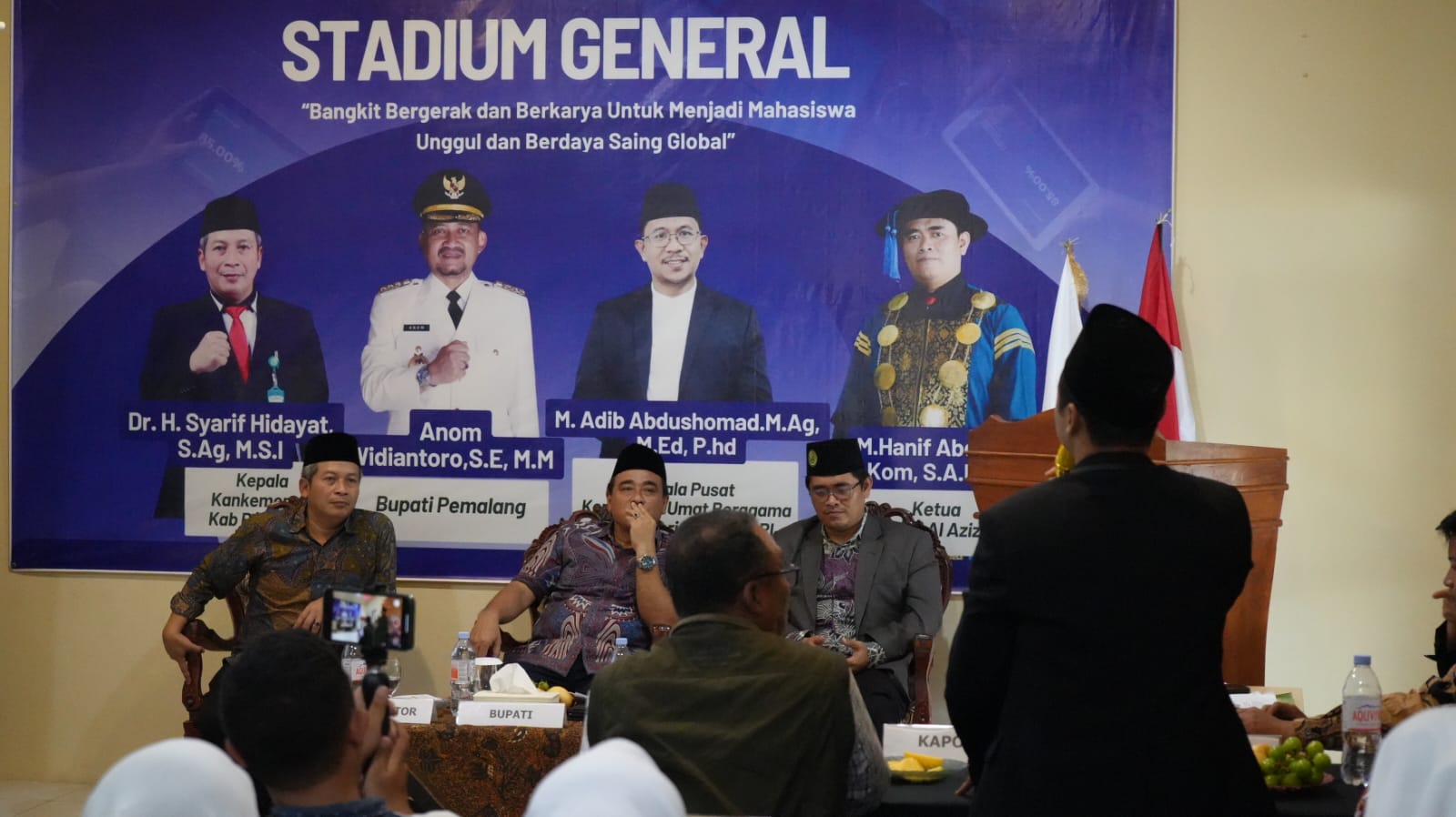 Narasumber lain dalam kegiatan Pengenalan Kehidupan Kampus Mahasiswa Baru (PKKMB) STEMBI Al-Aziziyah yaitu Kepala Pusat Kerukunan Kerukunan Umat Beragama Kemenag RI, Adib Abdhusomad dan Kepala Kantor Kemenag Pemalang Syarif Hidayat sebagai moderator. (**)