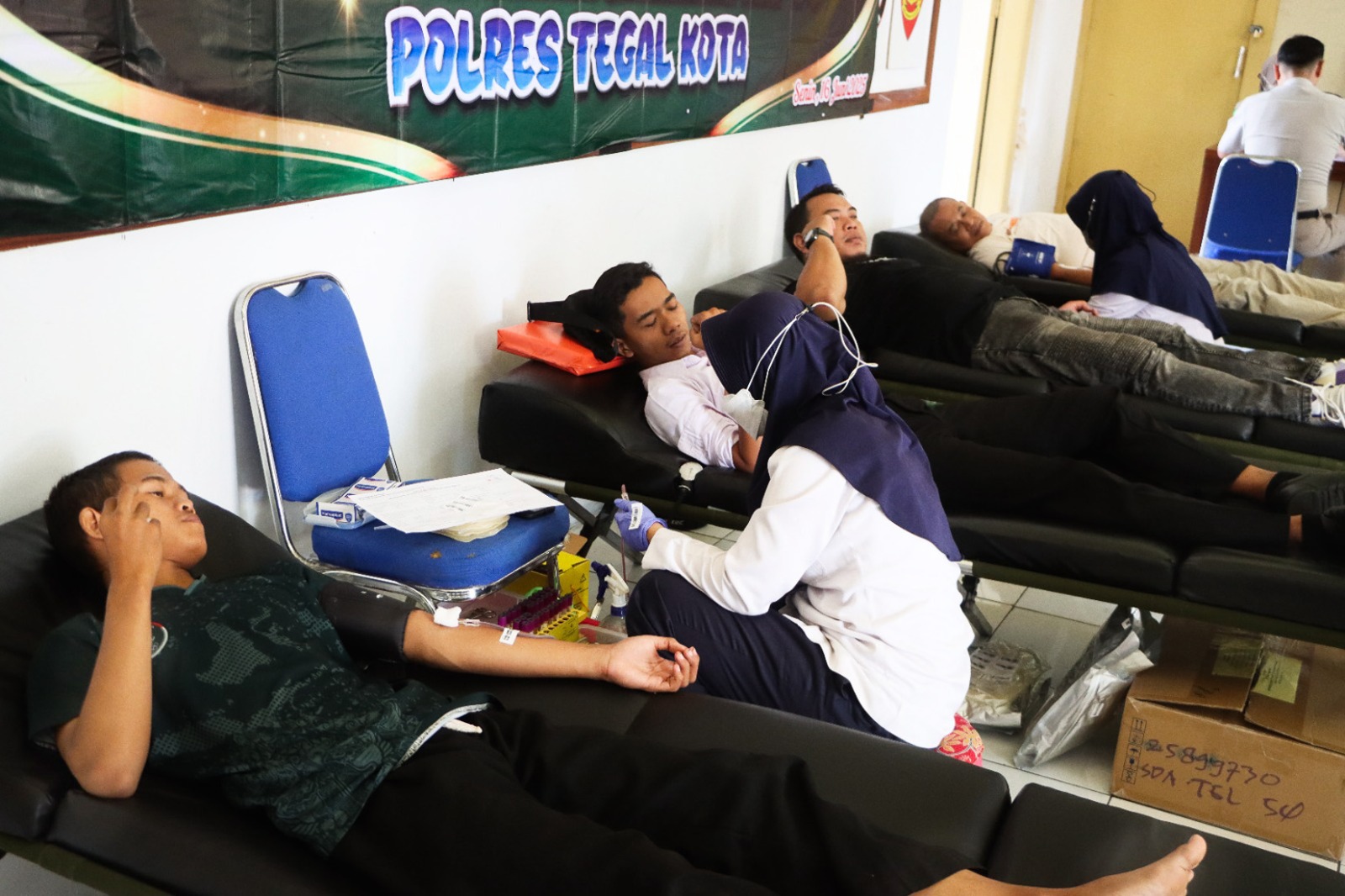TEGAL, smpantura – Berbagai elemen warga, mulai pelajar, prajurit TNI dari Marinir Pangkalan TNI AL (Lanal) Tegal, Kodim 0712/Tegal, ASN Satpol PP, ASN Polres Tegal Kota, personel Polres Tegal Kota, dan ibu-ibu Bhayangkari Cabang Tegal Kota, antusias mengikuti kegiatan bhakti sosial donor darah, di Aula Bhayangkari Polres Tegal Kota, Senin (16/6).