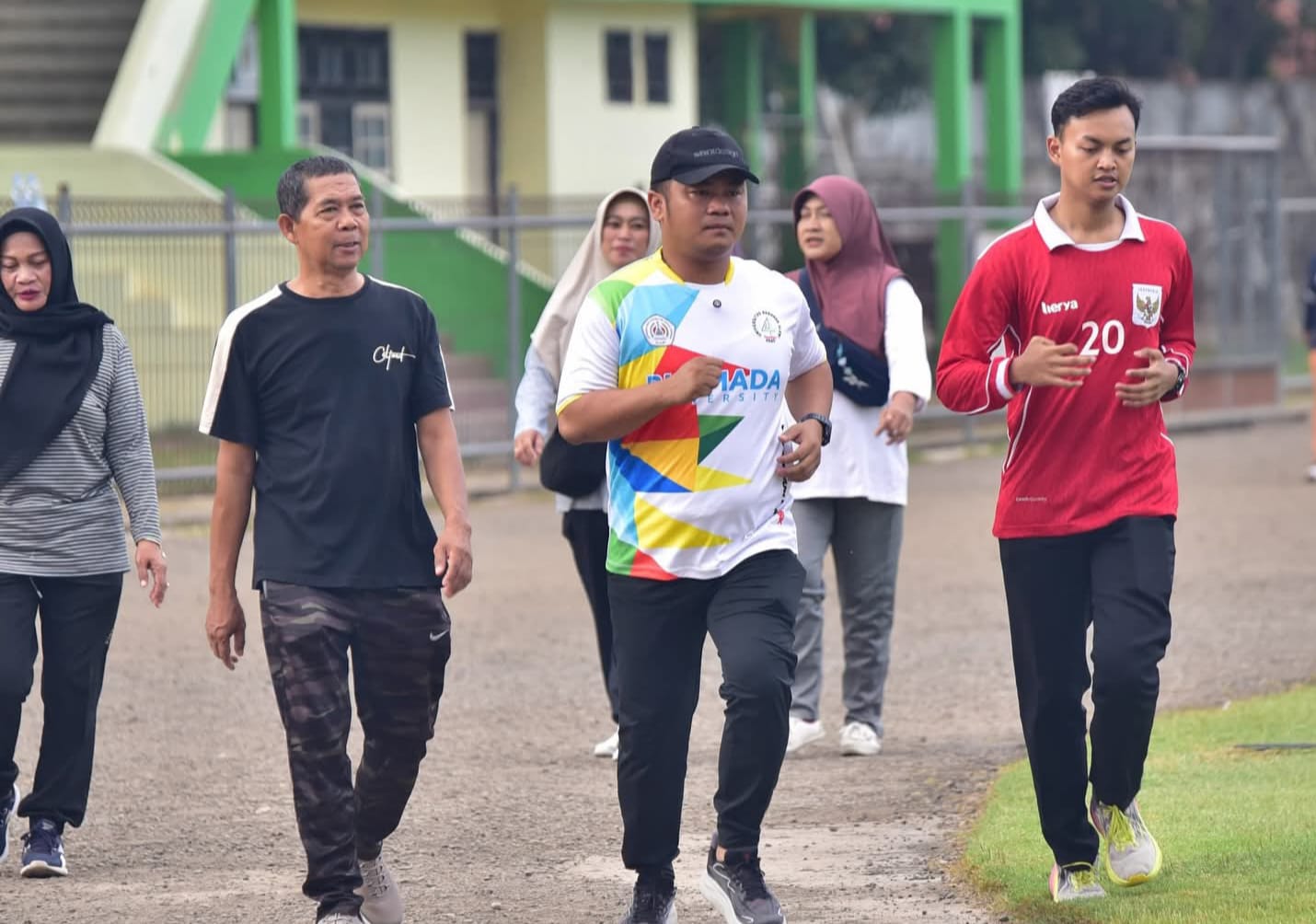 SLAWI, smpantura – Bupati Tegal, H Ischak Maulana Rohman tengah rutin jogging di GOR Trisanja Slawi sejak 29 Juli 2025. Hal itu sebagai upaya untuk mempromosikan running track dan jogging track di icon pusat olahraga di Kabupaten Tegal tersebut.
