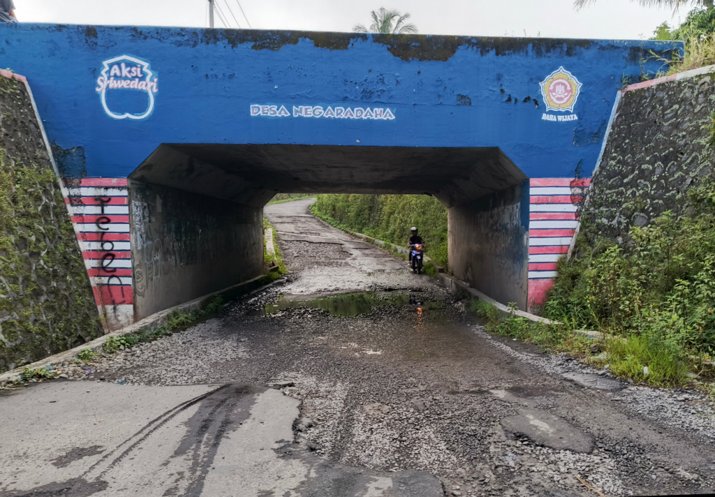 BREBES, smpantura – Kondisi jalan di bawah underpass Negaradaha yang berada di ruas Jalan Negaradaha–Kretek, Kecamatan Bumiayu, Kabupaten Brebes, dikeluhkan para pengguna jalan. Aspal yang hancur disertai genangan air membuat pengendara harus ekstra hati-hati saat melintas, terutama ketika hujan turun.