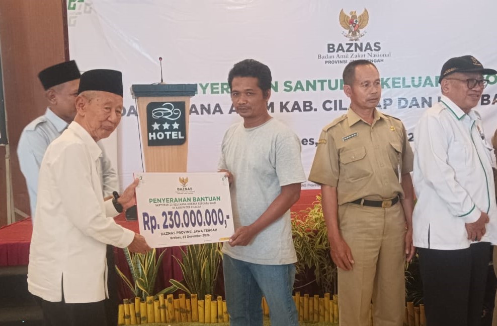 BREBES, smpantura – Baznas Provinsi Jawa Tengah (Jateng) memberikan bantuan senilai total Rp 510 juta, bagi para korban bencana alam di Kabupaten Cilacap dan Banjarnegara. Bantuan ini di serahkan simbolis kepada para ahliwaris oleh Ketua Baznas Jateng, KH Ahmad Darodji di Hotel Grand Dian Brebes, Selasa (23/12/2025).