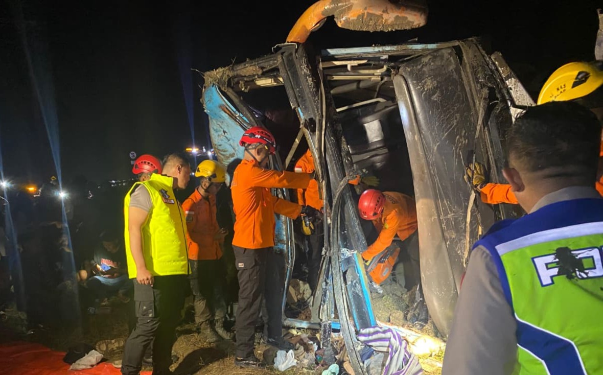 BREBES, smpantura – Jajaran Satlantas Polres Brebes melakukan Olah Tempat Kejadian (TKP) terhadap kecelakaan Bus PO Zentrum di ruas Tol Pejagan–Brebes (Kilometer) KM 259.300 A, Desa Banjaratma, Kecamatan Bulakamba, Kabupaten Brebes. Kecelakaan yang menyebabkan satu orang tewas dan puluhan penumpang luka-luka terjadi pada Selasa malam (17/3/2026).
