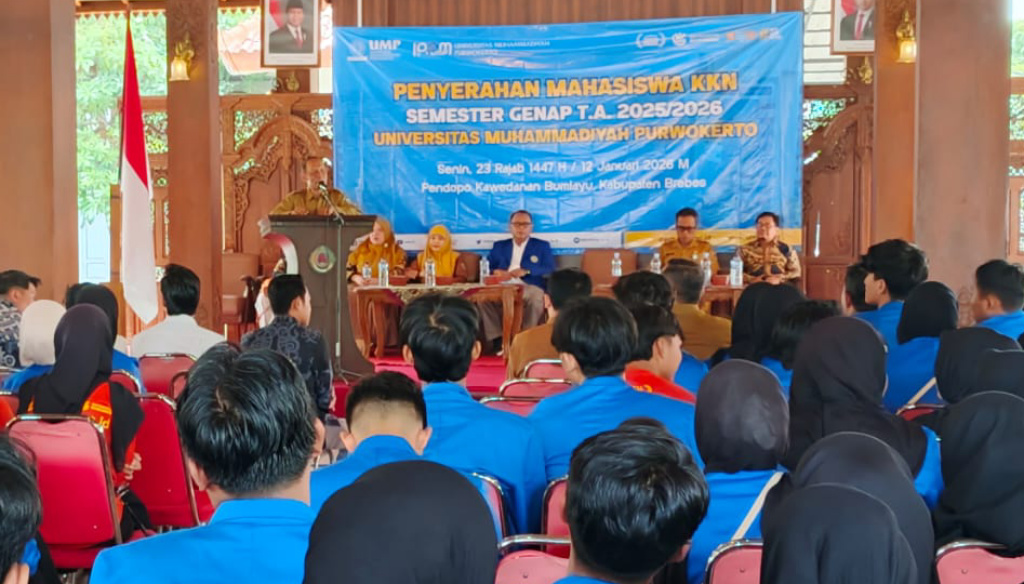 Prosesi penyerahan mahasiswa KKN di gelar di Pendopo Bumiayu, Senin (12/1/2026). Kegiatan ini di hadiri Wakil Rektor IV Bidang Riset, Inovasi, dan Publikasi UMP, Assoc. Prof. Akhmad Darmawan, Ph.D., serta perwakilan Pemerintah Kabupaten Brebes.