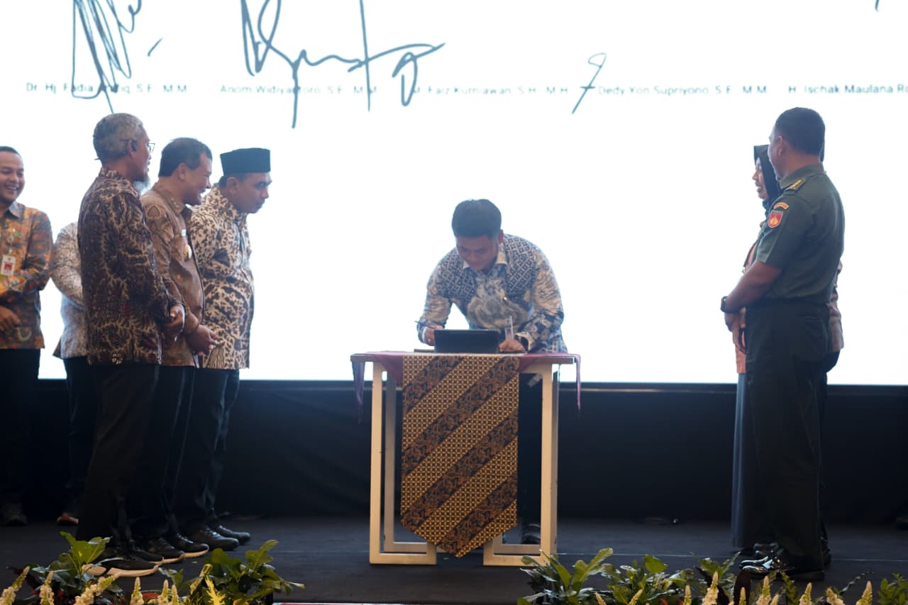 SURAKARTA, smpantura – Bupati Tegal Ischak Maulana Rohman menghadiri dan menandatangani Komitmen Bersama Pencapaian Target Kinerja Ketahanan Pangan Jawa Tengah Tahun 2026 yang dipimpin langsung oleh Gubernur Jawa Tengah Ahmad Luthfi, di The Sunan Hotel Solo, Kota Surakarta, Rabu (14/1/2026).