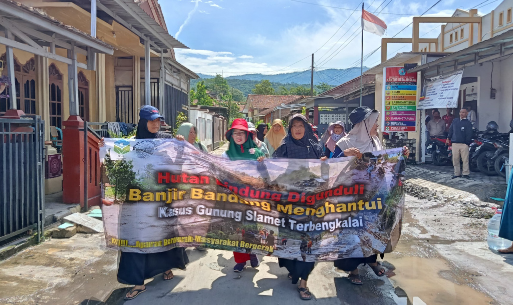 Para emak-emak juga menilai kerusakan hutan di lereng Gunung Slamet memperbesar risiko banjir. Berkurangnya tutupan vegetasi menyebabkan air hujan langsung mengalir ke pemukiman warga, merusak rumah dan fasilitas umum, serta mengganggu aktivitas harian.