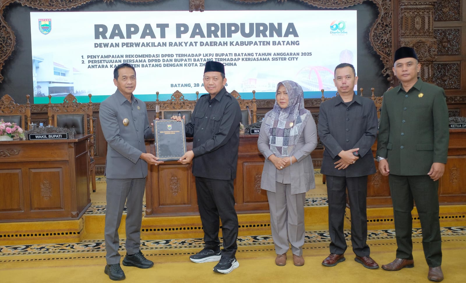 REKOMENDASI LKPJ: Ketua DPRD Batang Suudi (kedua dari kanan) memberikan rekomendasi LKPJ 2025 kepada Wakil Bupati Suyono dalam Rapat Paripurna di Ruang DPRD Batang, Kabupaten Batang, Selasa (28/4).