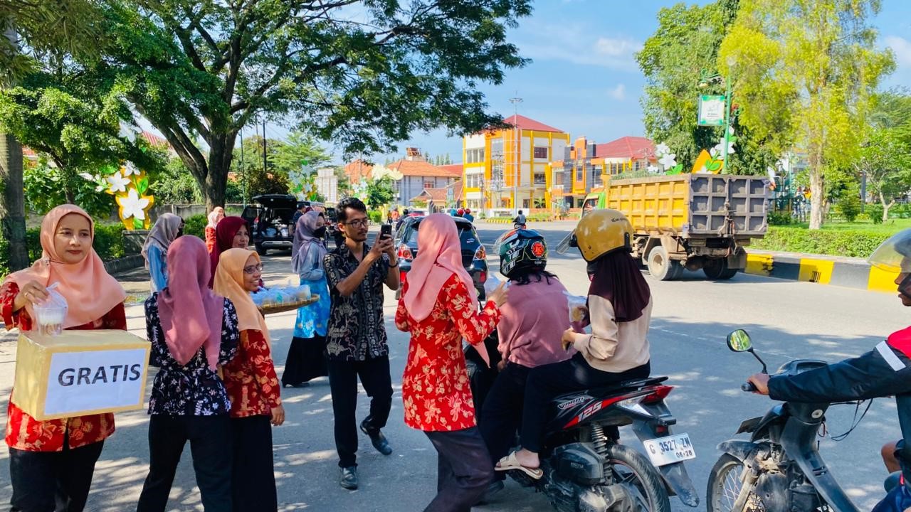 BAGI TAKJIL: Anggota Dharma Wanita Persatuan (DWP) Dinas Perpustakaan dan Kearsipan (Disperpusip) Kabupaten Tegal membagikan ratusan paket takjil kepada pengguna jalan yang melintas di kawasan Bundaran Tugu Poci, Kamis (12/3/2026) sore.